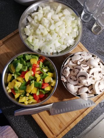 Snij alle groentes in de gewenst te vorm. Bak als eerste de uien en de knoflook aan in een pan met olijfolie en voeg daarna de paprika’s toe. Als de uien en paprika’s glazig zijn, voeg je de champignons toe. Als dit zo goed als gaar is doe je het in een grote pan. Dan rul je ook nog even het gehakt en voeg je dit bij de uien, paprika’s, champignons in de grote pan.