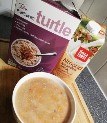 Dit product heb ik daarom ook maar gelijk eruit gepakt en getest. Ook zat er een pak ongezoete amandelmelk in, dus daar kon ik de porridge mee maken. Ook had ik er nog wortel doorheen gedaan, zo heb ik mijn eerste lading groente al binnen. In deze porridge zitten ook kleine stukjes dadel, waar het mee gezoet is.