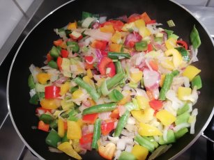 Kluts 3 eieren met een scheutje room los in een kom. Verhit olie in een pan en wok daarin heel kort de groente die jij heb uitgekozen. Dan giet je het eimengsel erover heen en laat je dit op laag vuur gaar worden.
