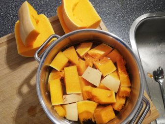 Verwarm de oven voor op 220 graden. Snij de pompoen en paprika in blokjes. Rooster dan de pompoen en de paprika voor ongeveer 20 minuten in de oven met een beetje olijfolie erover.