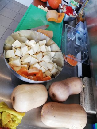 Snij de pompoen in blokjes en schil de zoete aardappel en snij deze ook in blokjes.