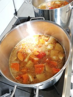 Fruit de ui, knoflook en rode peper aan in de pan. Doe daarna de bouillon, pompoen en zoete-aardappel erbij. Bren dit aan de kook.