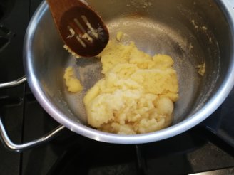 Nu kan de pan weer terug op middelhoog vuur en blijf voor 2 tot 3 minuten goed roeren. Het deeg zal nu een bal vormen en wat aanbakken op de bodem. De bloem wordt nu dus gegaard, dit is belangrijk voor het rijzen van de soesjes.