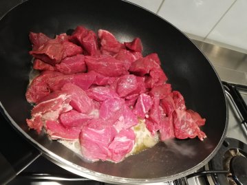 Verhit een stoofpan met wat olijfolie en doe hierin het rundvlees. Bak in de andere pan nog kort de uien. (maak de pan tussendoor niet schoon, het bakvocht van het rundvlees geeft juist extra smaak)