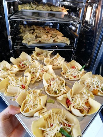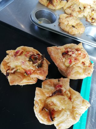 Meng in een kom de eieren, je gewenste vulling, scheutje room en kruiden. Als dit goed gemengd is, doe je de vulling in de bladerdeeg bakjes. Verdeel de kaas erover en dan kunnen ze in de oven.