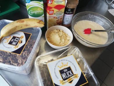 Mix de bananen, met de eieren en de yoghurt tot een gladde massa. Daarna roer je de rest van de ingrediënten erdoor.