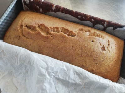 De cake gaat voor ongeveer 40 tot 45 minuten in de oven. Zodra de cake klaar is, laat je hem voor ongeveer 10 minuten afkoelen in de cakevorm. Daarna haal je het bananenbrood uit de vorm laat je hem verder afkoelen op een rooster.