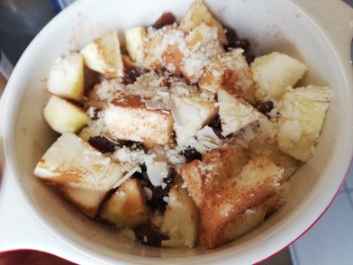 Snij de appel in stukjes en meng dit met de kaneel, rozijnen en amandelschaafsel. Doe de mix in een oven bestendig schaaltje.