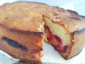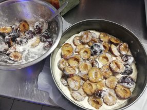 Doe de helft van het beslag in een met bakpapier bekleedde springvorm van ongeveer 24cm. Daarboven gaan de pruimen en top je het af met de rest van het beslag.