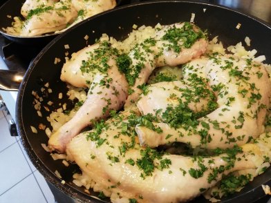 Daarna haal je de kippenbouten uit de pan en laat je deze afkoelen. Gooi de saus in de pan niet weg.