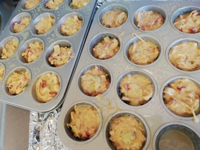 Snij de groentes in kleine blokjes. Meng daarna alles goed door elkaar en dat is je beslag al. Doe het beslag in een ingevette muffin-blik en zet ze voor 20-30 minuten in de voorverwarmde oven.