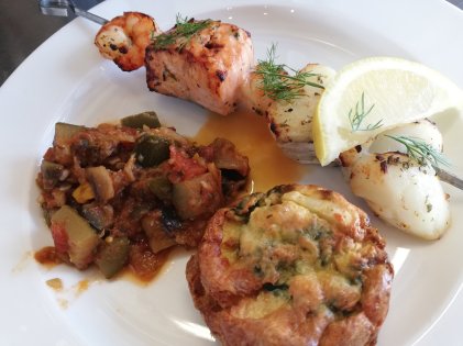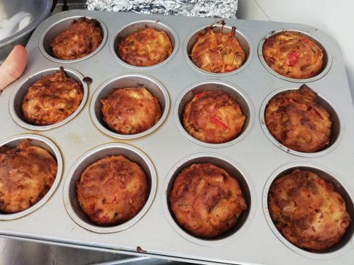 Heerlijk als hartige snack, voor bij de lunch, borrel of zoals ik heb gedaan, geserveerd bij het hoofdgerecht als garnituur. Het fijne is dat voor de muffins alleen een kom, spatel, muffin-blik en oven nodig heb. Geen gedoe met mixers. Ze kan in het recept variëren met verschillende ingrediënten en binnen 10 minuten staan ze in de oven.