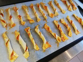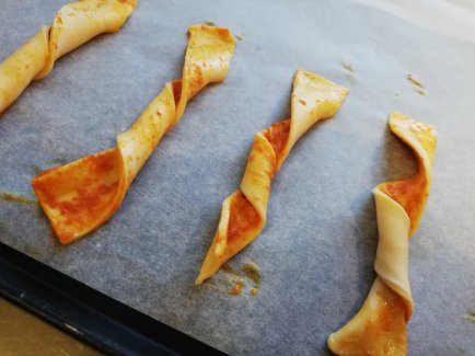 Laat het bladerdeeg ontdooien. Uit één plakje bladerdeeg haal je vijf sticks.
