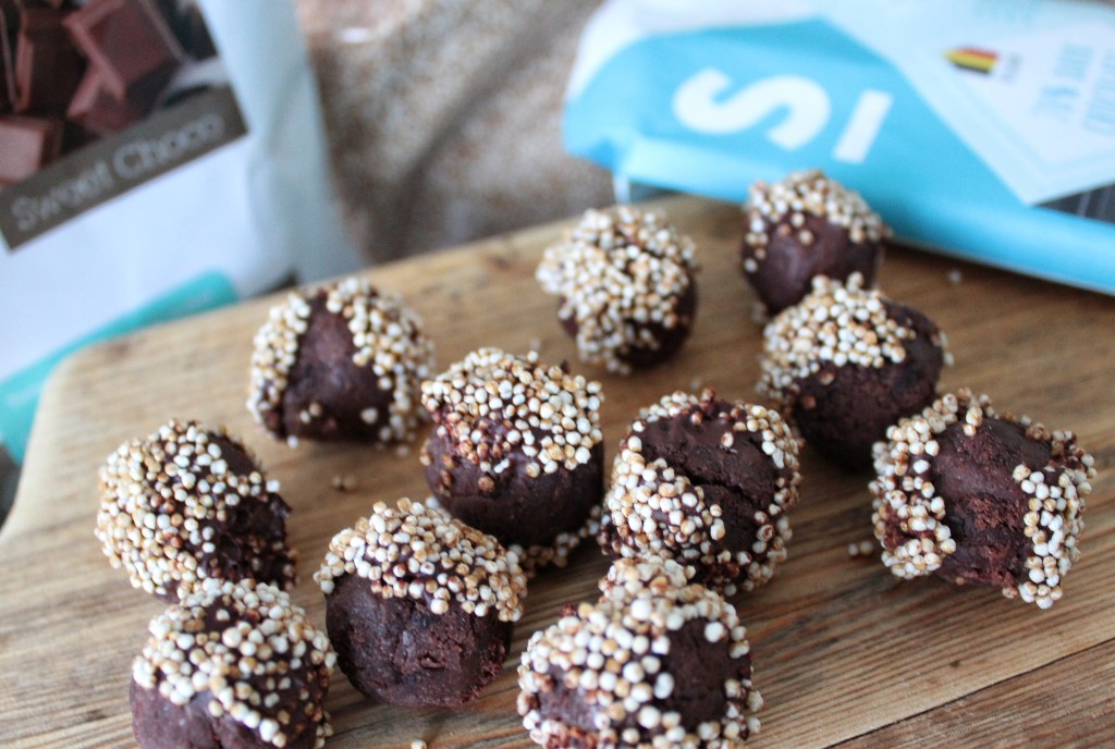 Smelt wat chocolade au bain marie. Dip hierin de balletjes en top ze daarna met topping naar wens. (ik heb hierbij de gepofte amaranth gekozen, maar je kan ook kiezen voor sprinkles, hagelslag, kokosschaafsel etc. Daarna laat je de chocolade even hard worden in de koelkast en dan zijn ze klaar om op te eten.