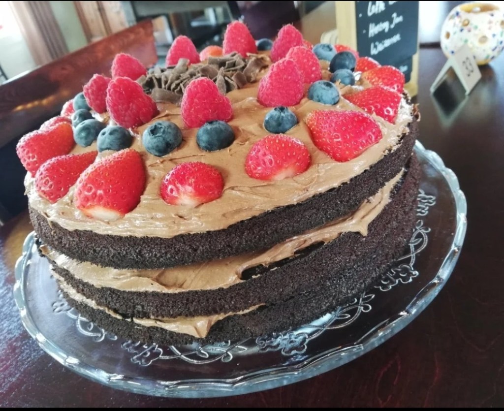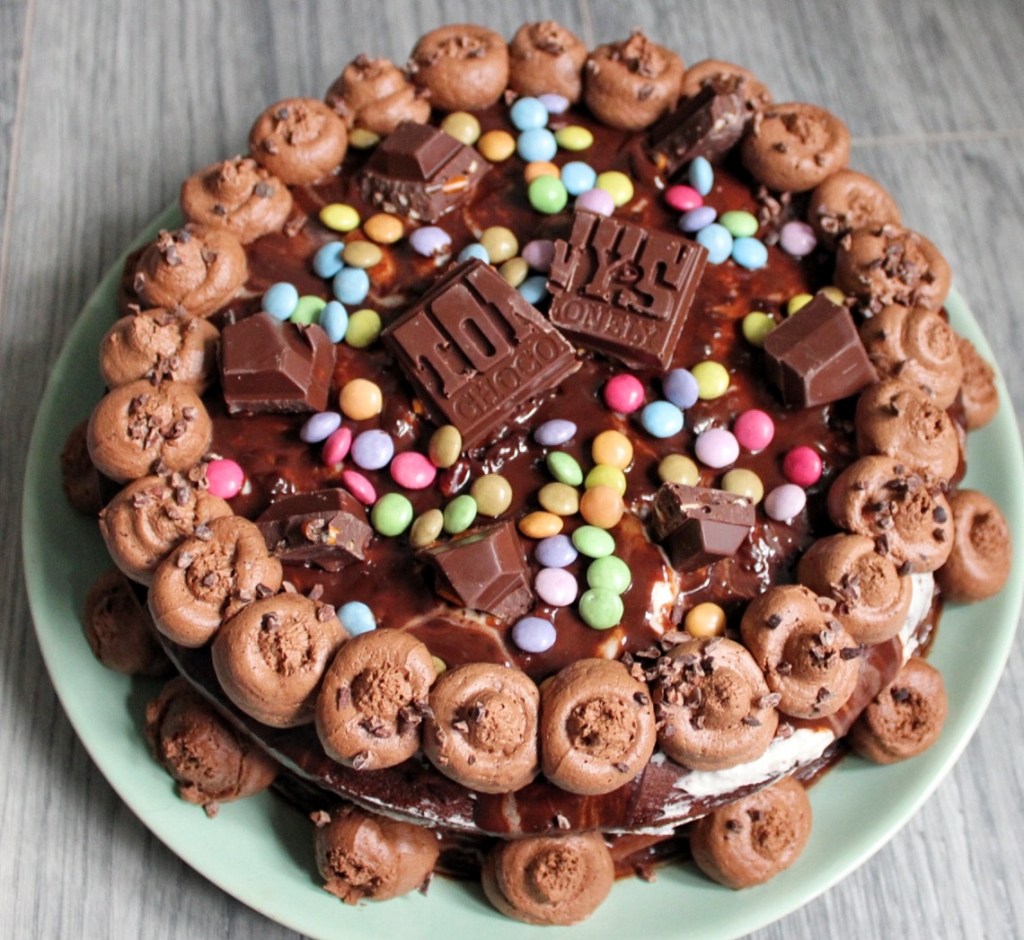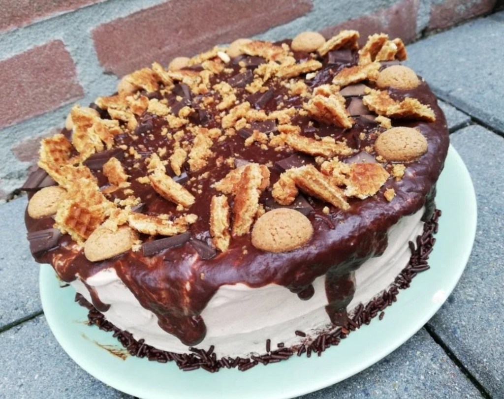 En klaar is je heerlijke chocoladetaart. Natuurlijk kan je ook variëren met de vulling. Zoals ipv de chocolade erdoor te doen iets van sinasappelrasp of jam er doorheen te spatelen. Ook erg lekker!