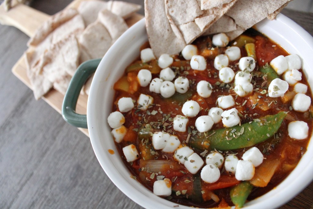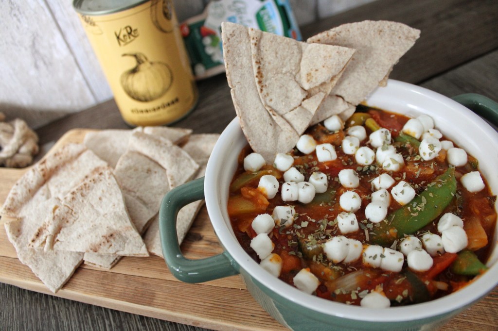 Laat het geheel nog een paar minuten op laag vuur staan en daarna is het tijd om het te serveren. Verdeel de geitenkaas erover en wat Oregano en serveer het met heerlijk Libanees volkoren brood.