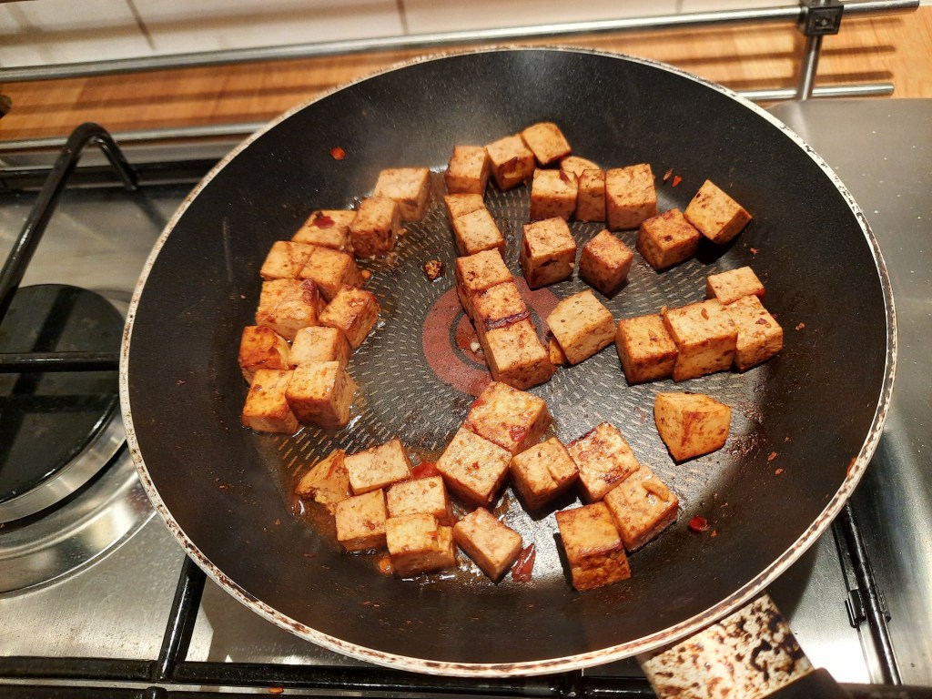 Verhit een eetlepel olie in een koekenpan. Bak hierin de tofu tot ze knapperig aanvoelen.