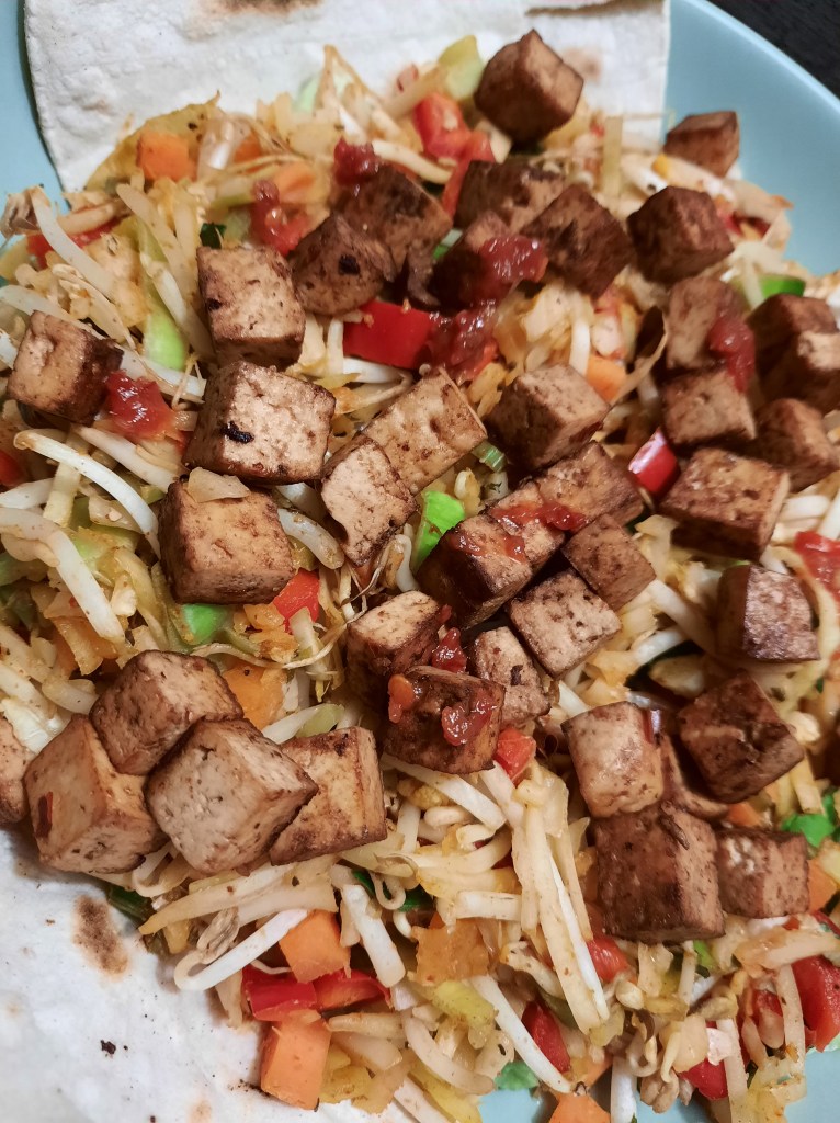 Serveer de tofu met zoals op de foto met tortilla’s en groente of maak er een lekkere poke bowl, wok met noedels of rijst mee.