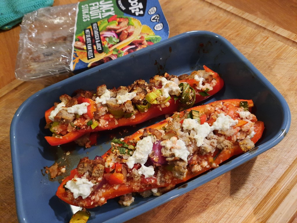 Verhit wat olie in een wok en wok hierin kort de wokgroente en de jackfruitstukjes. Voeg na 2 minuten de tomatenblokjes en kruiden toe. Wok dit een minuut samen en voeg dan de couscous toe. Zet het vuur uit, roer alles nog even goed door en vul daarna de paprika met de vulling. Top het af met nog wat lekkere hüttenkäse of andere kaas en zet de ovenschaal voor ongeveer 20 minuten in de doorwarmde oven.