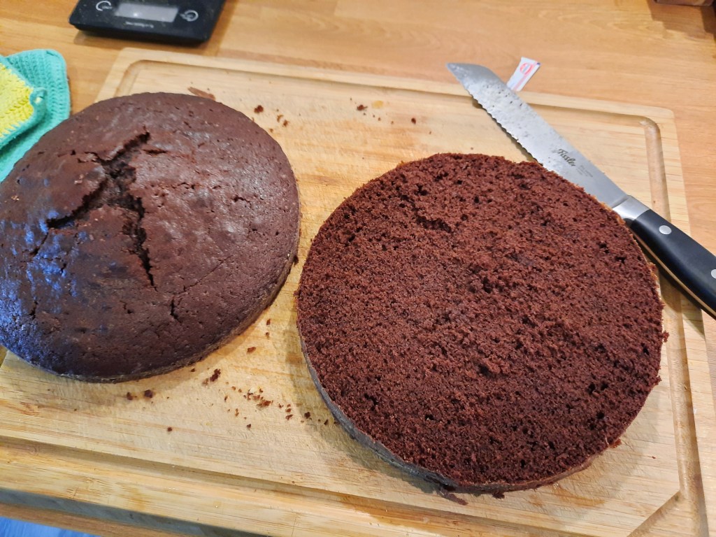 Als de taart is afgekoeld, snij je deze doormidden en vul je hem met de vulling.