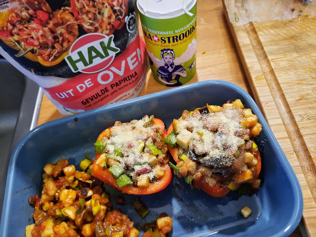 Omdat ik alleen eet, heb ik de helft van de zak gebruikt, hier heb ik nog wel extra gebakken aubergine en prei aan toegevoegd. Ik heb één paprika door de helft gesneden en deze gevuld met de mix. Hier heb ik nog wat strooikaas over gedaan en volgens de gevulde paprika’s voor 20 minuten in de oven gedaan. Het was dus makkelijk en snel te maken. Daarnaast heb ik er aardappeltjes uit de oven bij gemaakt, maar je kan er ook rijst, couscous of bulgur etc bij serveren.