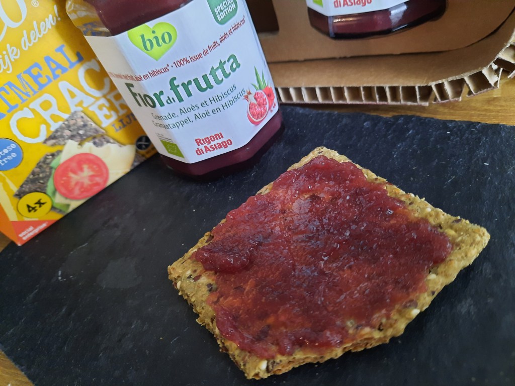 Granaatappel, Aloë en hibiscus is natuurlijk ook gemaakt van biologisch fruit van topkwaliteit. Door de combinatie van granaatappel met de intense geuren en kleuren van aloë vera en hibiscusbloemen heeft de fruitspread een frisse en niet te zoete smaak. De granaatappel, Aloë en hibiscus is wel een special edition. Wanneer je deze smaak ook wilt proberen, moet je er niet te lang mee wachten, want ik weet niet hoe lang deze te koop zal zijn.