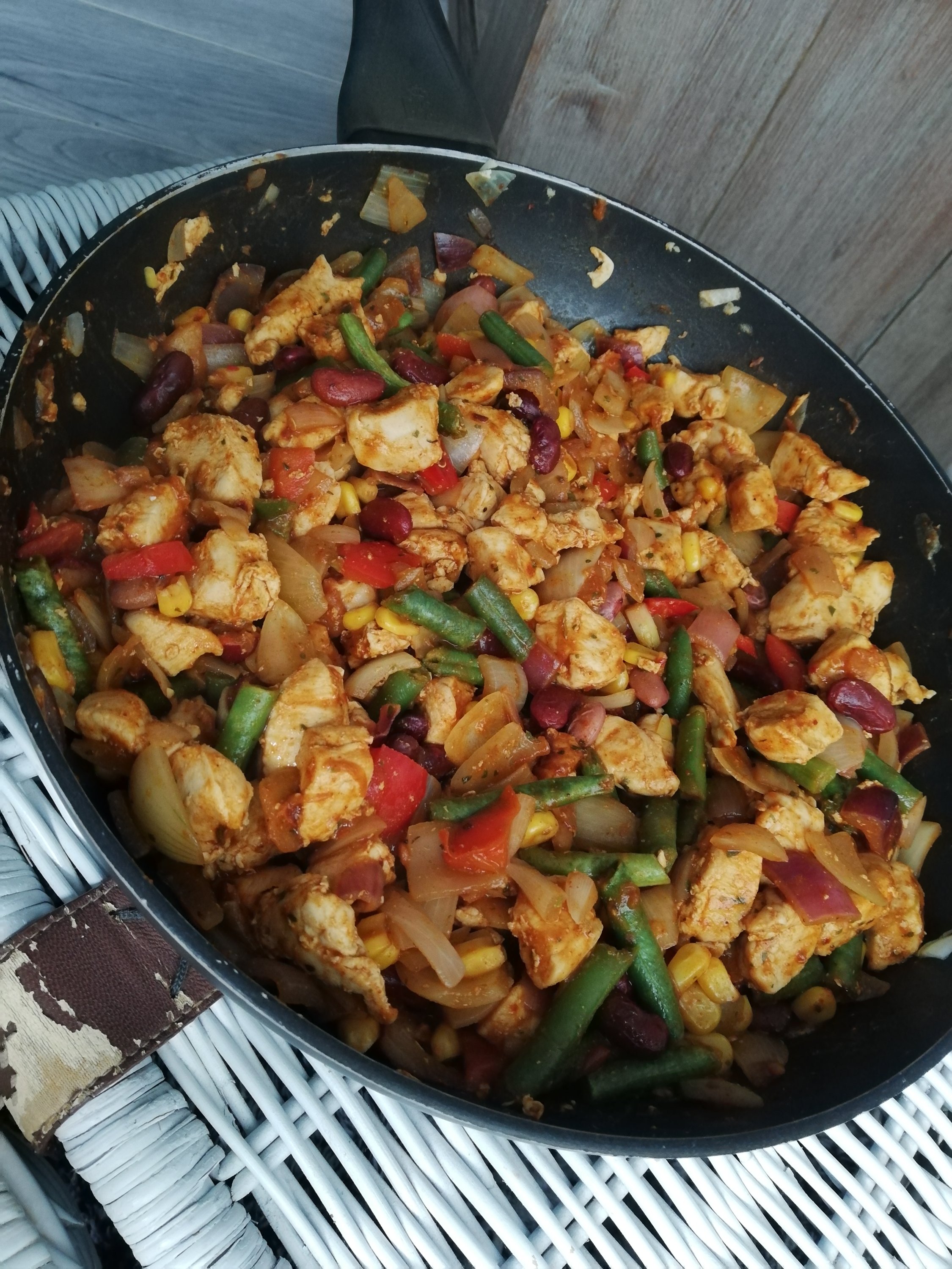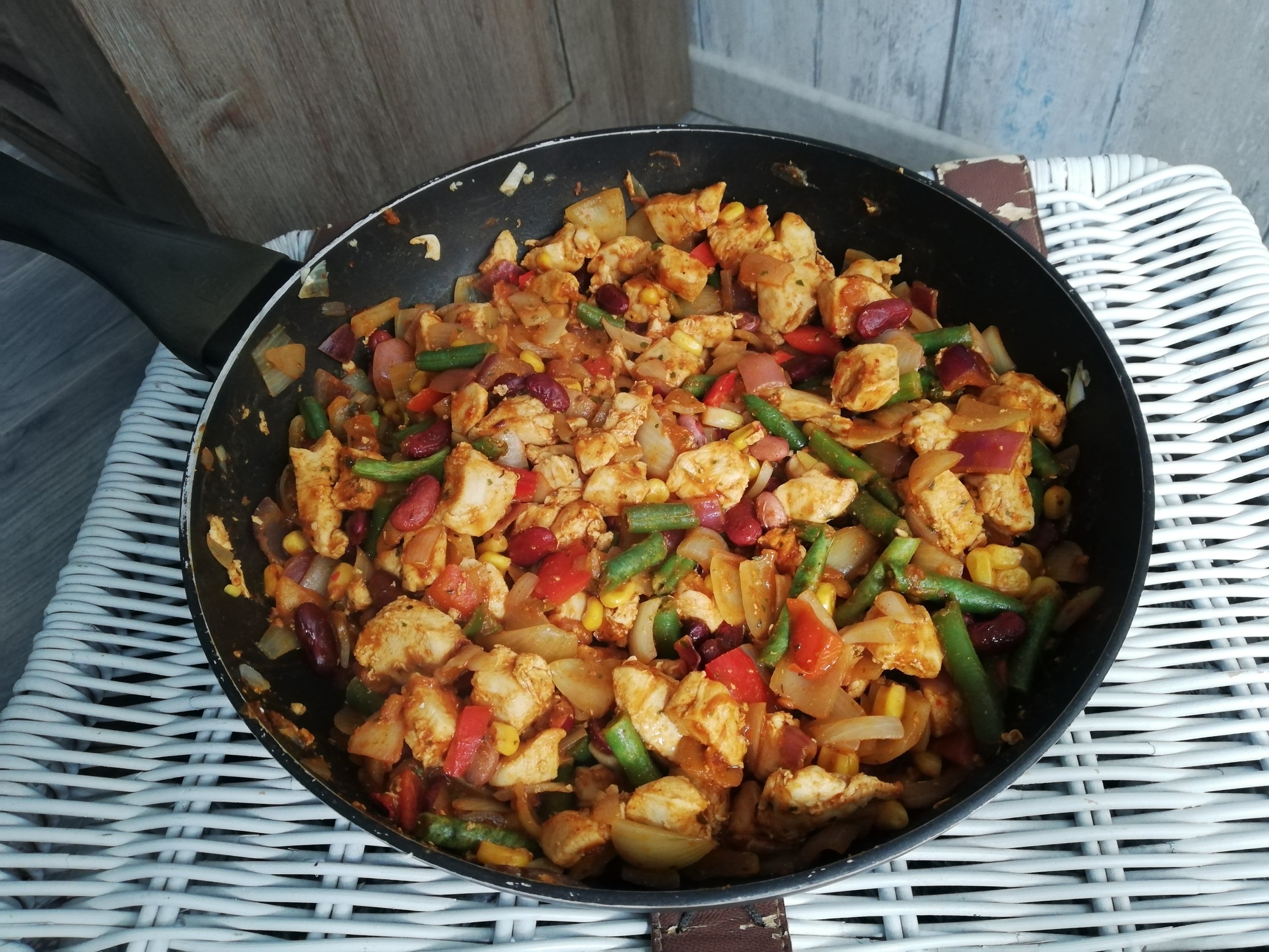 Verhit dan een wok met een scheutje olijfolie en bak hierin de kip, uien en paprika. Zodra de kip gaar is voeg je de bonen, mais, sperziebonen en alle kruiden toe. Voeg eventueel nog een klein scheutje water toe en bak het geheel voor ongeveer 2 a 3 minuten.