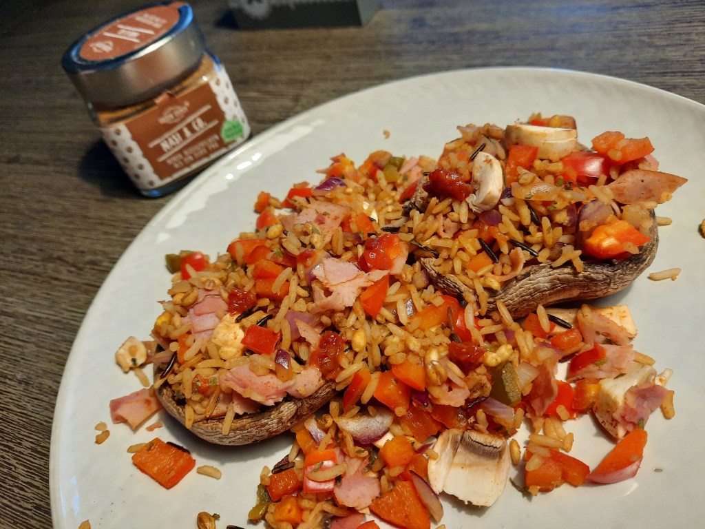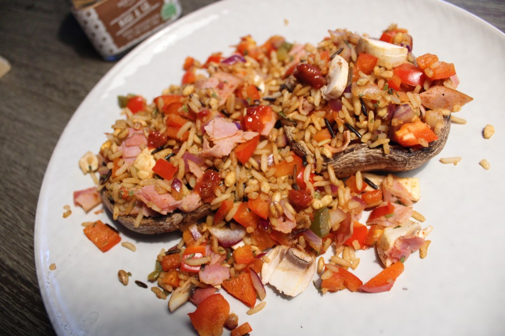 En klaar zijn je gevulde portobello’s met nasi, eet smakelijk!
