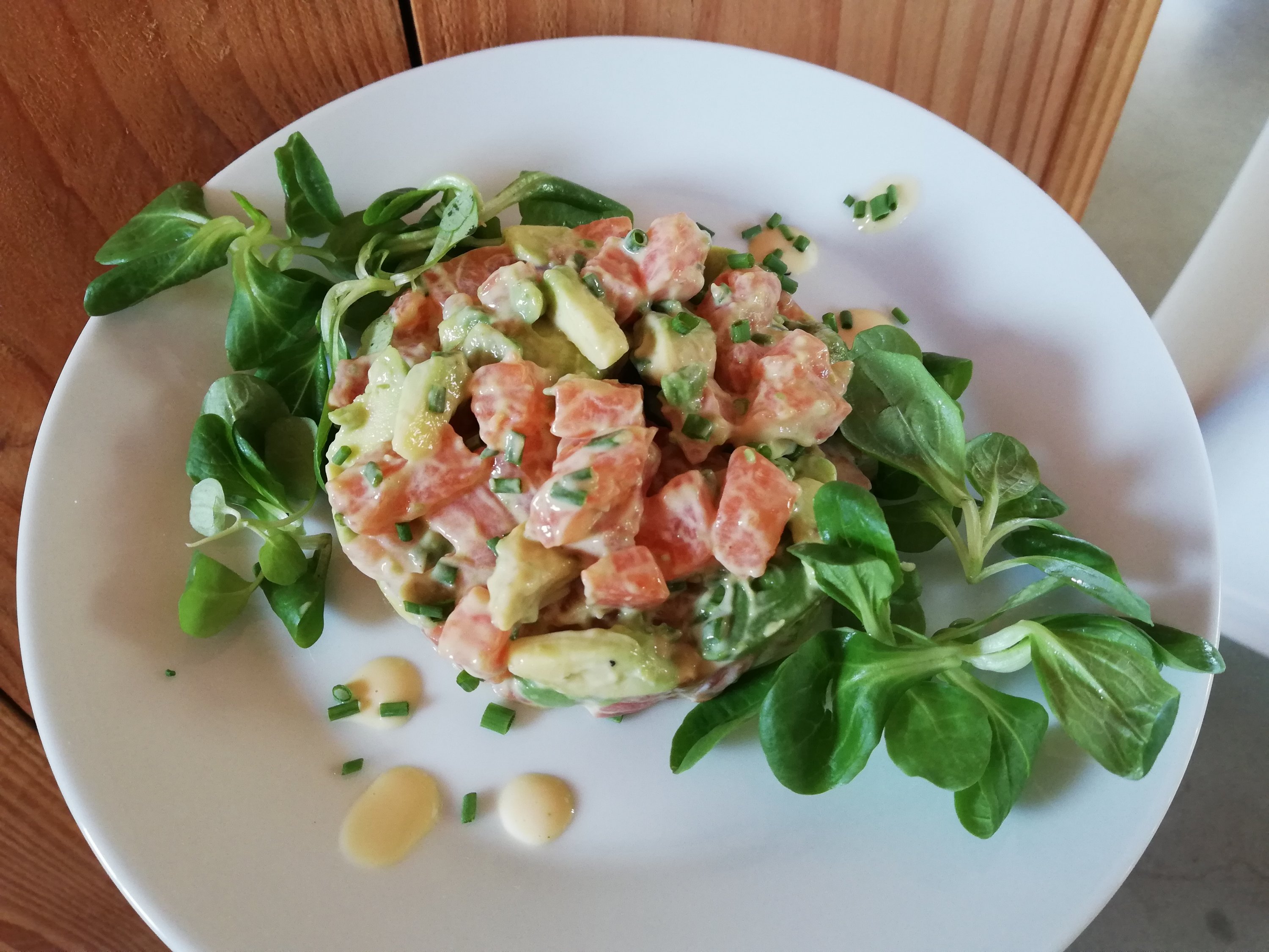 Snij de zalmfilet en avocado in kleine blokjes, snipper het sjalotjes en snij de bieslook in klein ringetjes. De gesneden zalm doe je samen met de avocado en het gesnipperde sjalotje in een schaaltje. Voeg hieraan limoen aioli toe. (hoeveelheid naar eigen smaak). Voeg ook de helft van de gesneden bieslook toe. Meng dit met een lepel goed door elkaar en serveer het op een bodje met wat veldsla. Maak het geheel af met de rest van de bieslook en klaar is je prachtige voorgerecht.