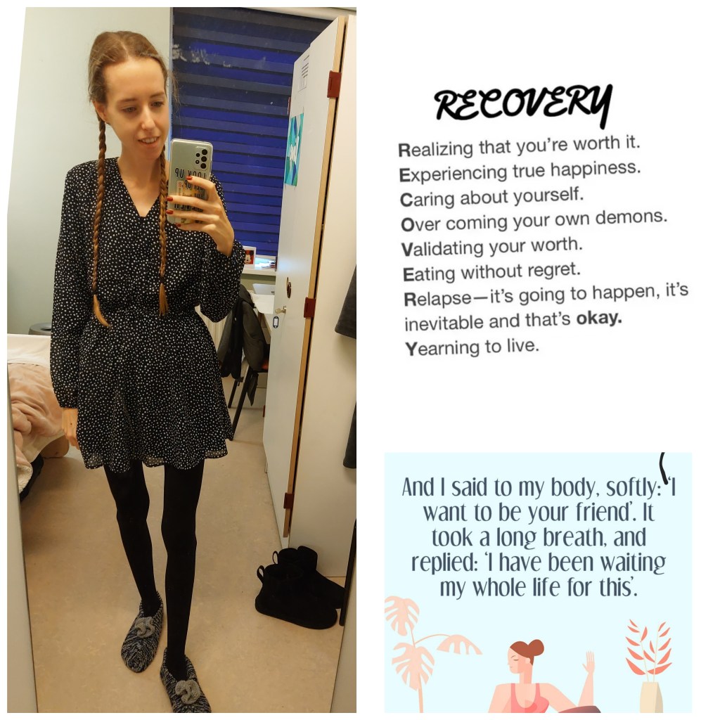 Dat is een lastige vraag. Ik kan moeilijk zeggen dat het goed gaat, want anders zou ik hier nu niet in de kliniek zitten. Ik wil ook niet zeggen dat het slecht gaat, want ik maak hier enorme stappen vooruit. Zulke stappen heb ik nog niet eerder durven te maken. Stappen omtrent hoeveelheid eten en in keuzes die ik maak in producten. Ik ga nu echt voor gezond worden en een leefbaar leven te krijgen. Of ik nog voor 100% kan herstellen? Dat denk ik niet. De eetstoornis zal altijd een plekje in mijn hoofd houden, maar wel ik ga wel zover als mogelijk herstellen waarin ik een leven kan leven zonder restricties en nare eetstoornisgedachtes.
