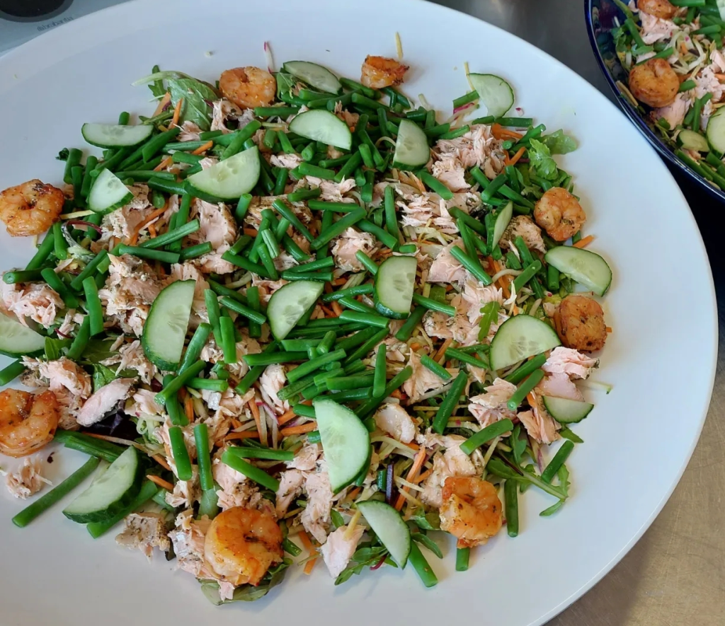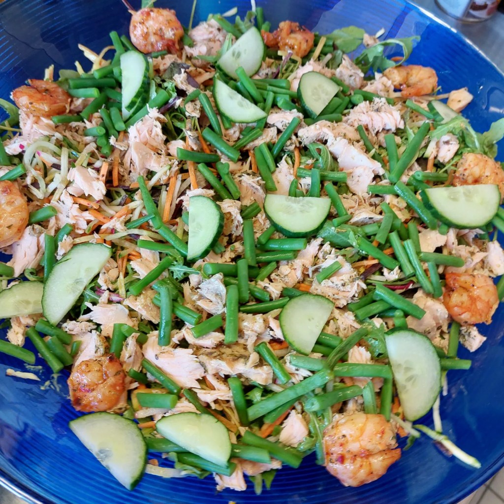 Vandaag heb ik weer een heerlijk recept voor een salade. Dit werd de laatste tijd vaak gevraagd, ondanks dat het nog geen echt salade weer is, deel ik toch alvast dit heerlijke recept met jullie. Deze salade lijkt een beetje op de salade nicoise, maar dan met zalm en gamba’s. Je kan de salade natuurlijk maken met groentes naar eigen wens. Het recept van mijn salade lees je hieronder.