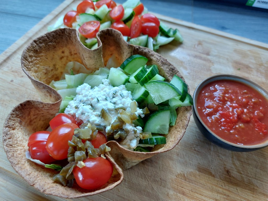Haal de tortilla uit de schaal en zet deze op een bord. Vul hem dan met de gesneden groente en top het af met de huttekase en salsasaus.