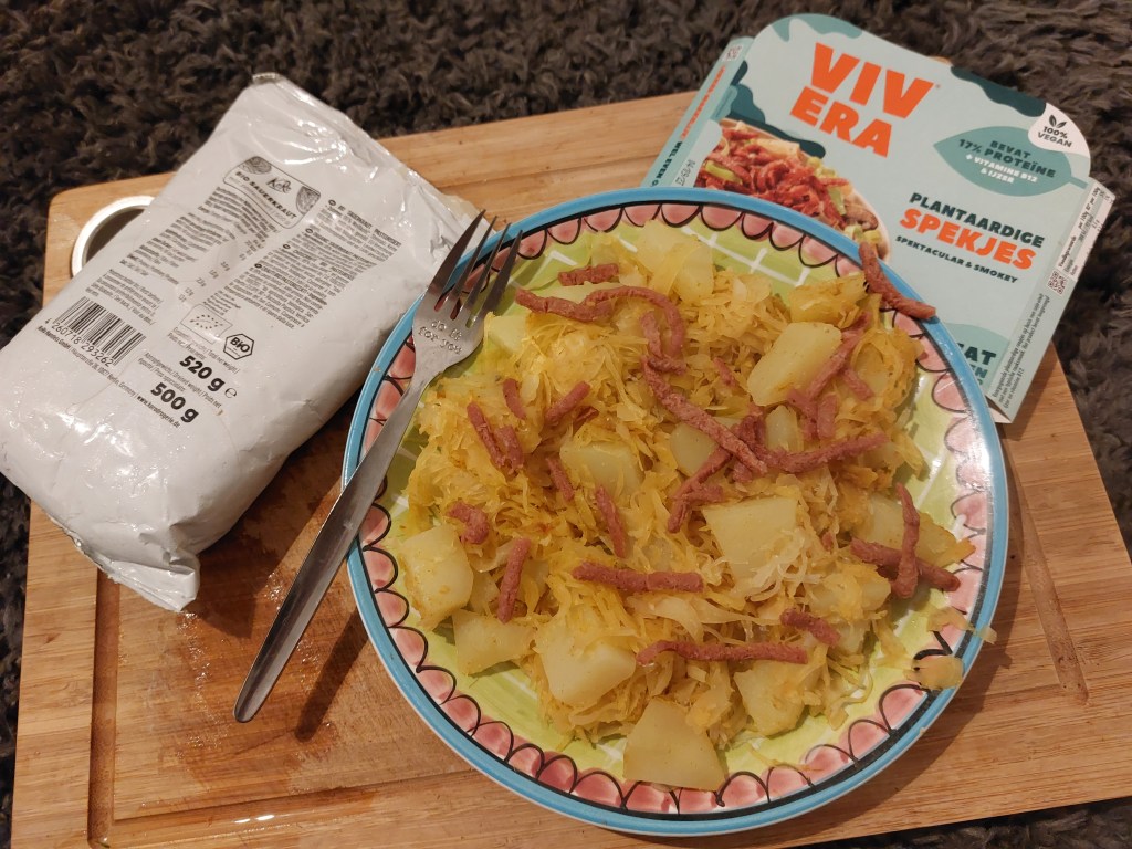 Vandaag heb ik weer eens een receptje voor het avondeten. Een lekker winters maaltje met zuurkool. Ik ben dol op zuurkool, heerlijk in de winter met aardappels en vlees/vega en in de zomer maak ik er altijd lekkere salades mee. Zuurkool is ideaal vind ik. Het is goed voor je darmen en het is ook nog eens goedkoop en het hele jaar verkrijgbaar.
