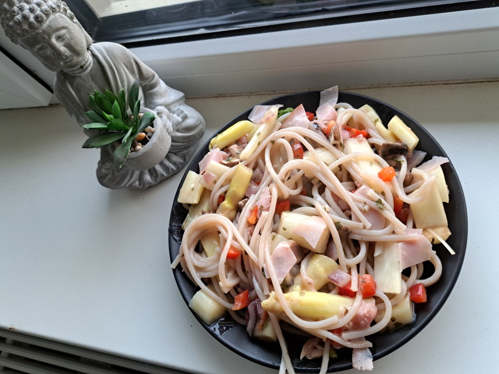 Breng het geheel eventueel nog verder op smaak met wat peper, zout en (gedroogde) bieslook en klaar is je heerlijke spaghetti met asperges.