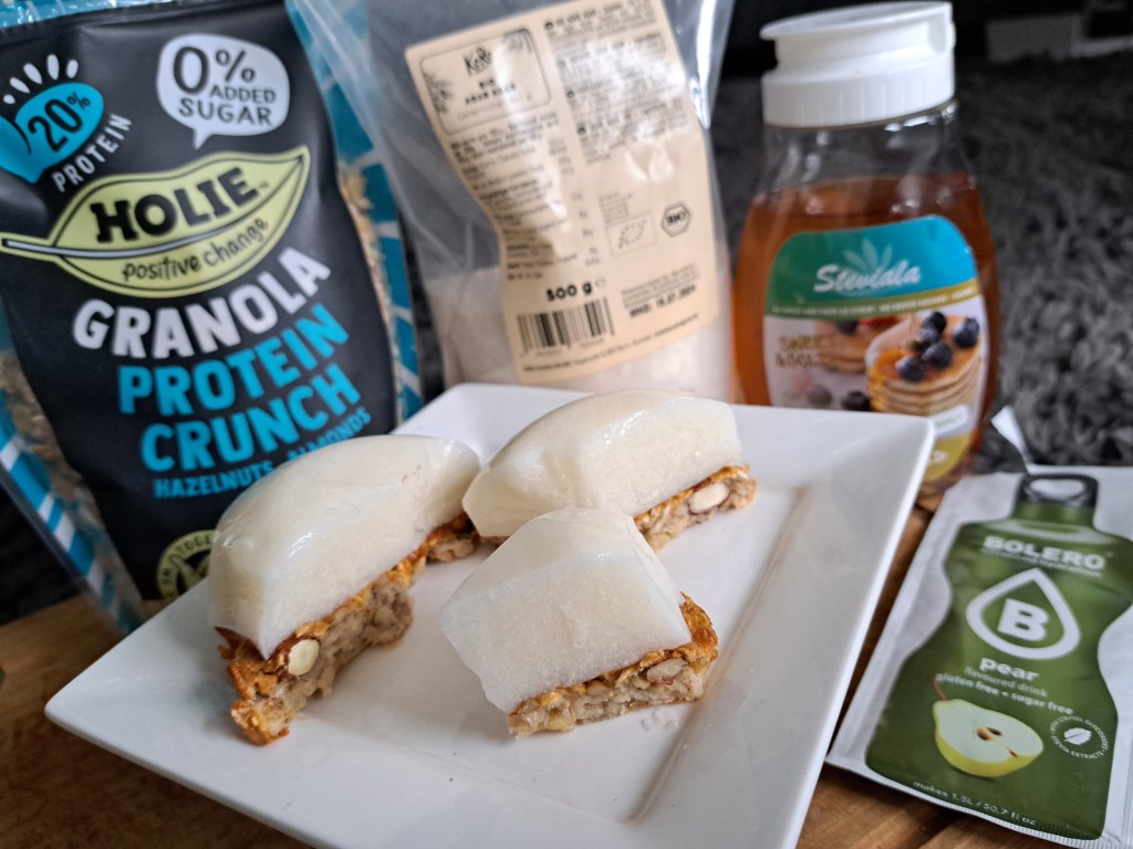Meng de granola en havermout met de syrup en het eiwit en druk dit plat als boden je taartvormpje. Bak dit voor 10 minuten in de airfryer op 150 graden.