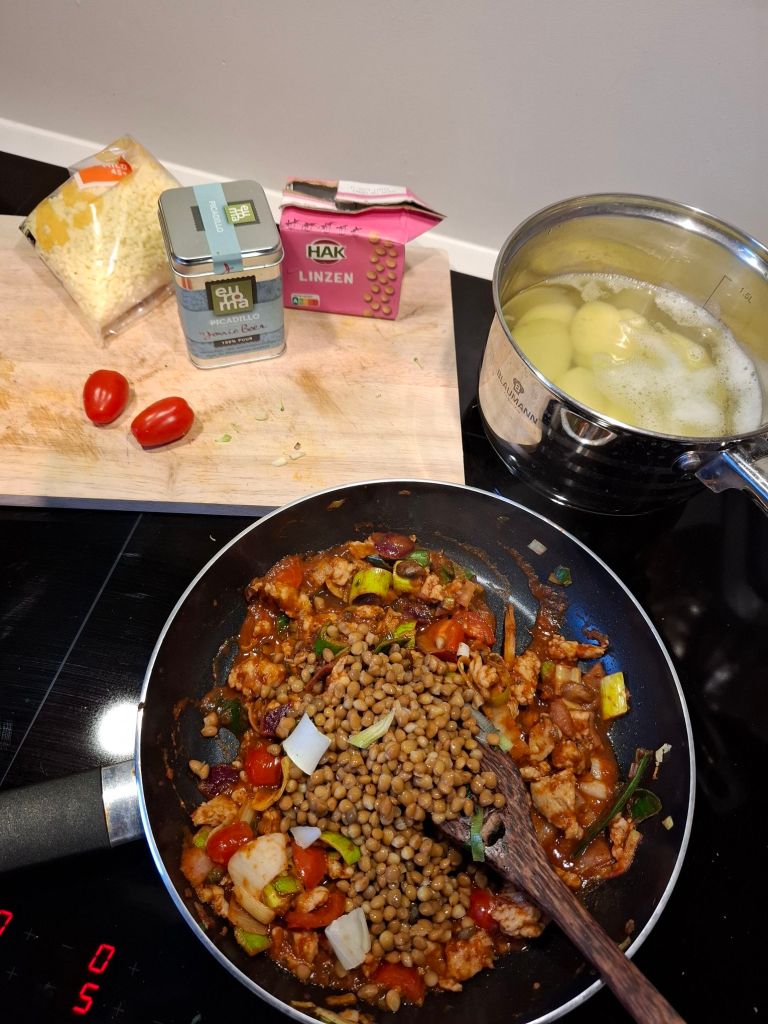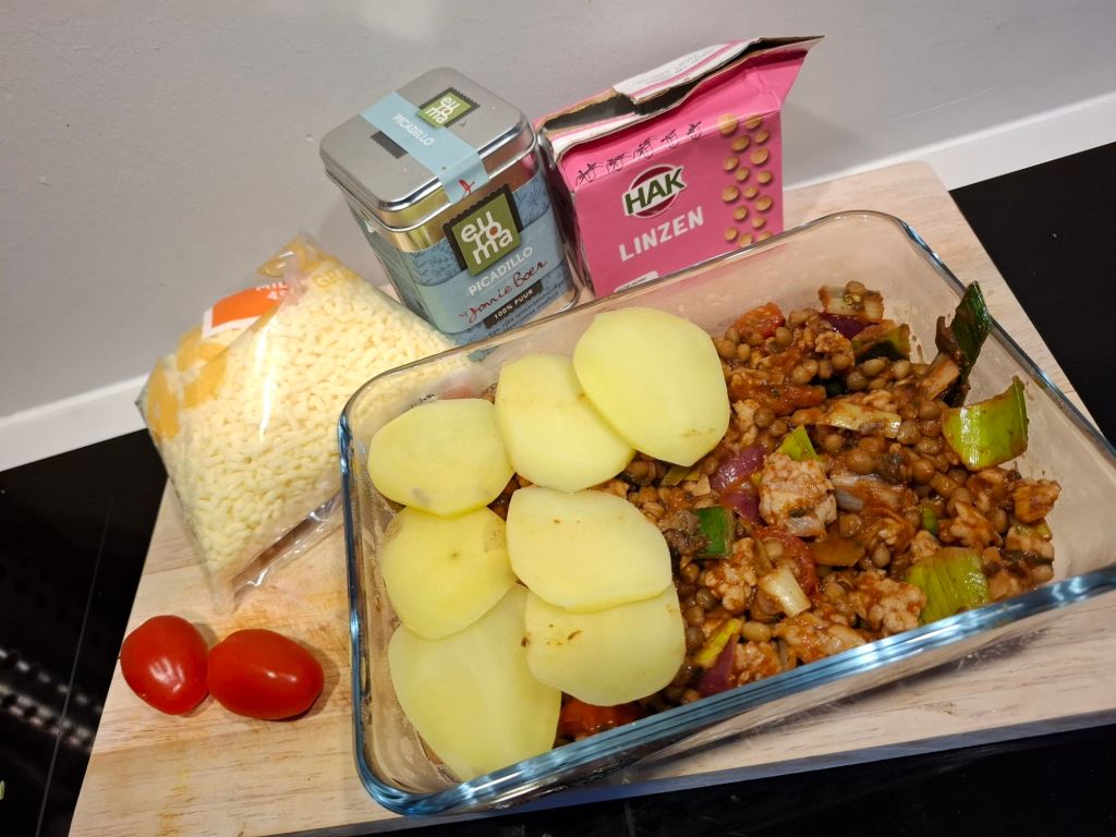 Verwarm wat olie in een pan, rul het kipgehakt en voeg dan de tomatenpuree, ui en prei toe. Bak dit samen voor zo’n 3/4 minuten. Voeg dan de kruiden, de gesneden snacktomaatjes, linzen en ongeveer 50 ml water toe. Als laatste roer je nog de crème fraîche erdoor. Laat dit geheel even 5 minuten pruttelen en verwarm ondertussen de oven voor op 200 graden.